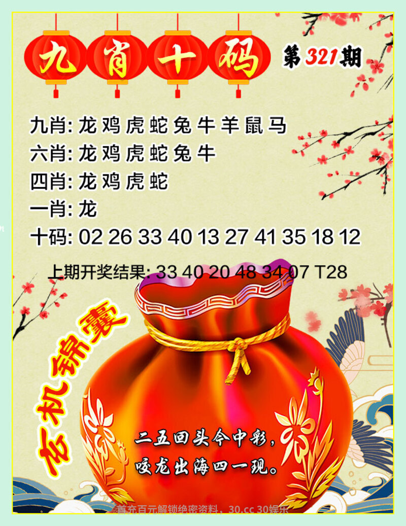 | 320期:一句话赢大钱【风高绿野苗千顷】 解料:风解出风肖虎兔龙,平特玄机是群龙无首的意思是一群八尺以上的良马缺乏头马引领,现多比喻群体因无领导者而难以统一行动 综合:虎狗羊鸡牛龙 |